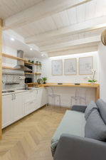 Al piano terra si sviluppa una funzionale e accogliente zona giorno, caratterizzata da una cucina su misura perfettamente integrata negli spazi, un comodo divano letto, oltre a una pratica zona lavanderia e un piccolo ripostiglio che ottimizza ulteriormente la vivibilità dell’ambiente.